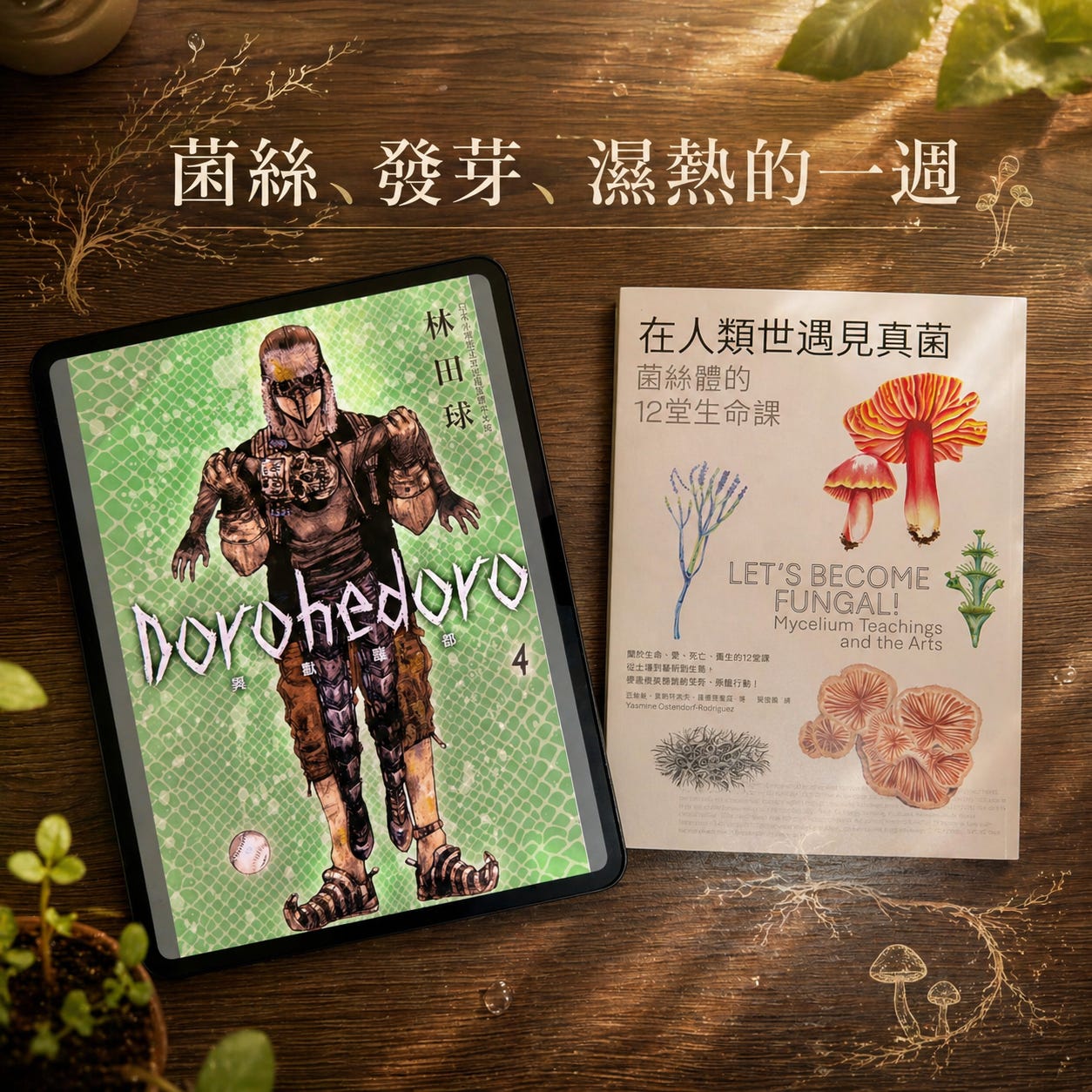 這週,真是菌絲、發芽、濕熱,又有點奇幻的一週啊。我一邊看著北台灣的雨,一邊看著柏油縫裡的小植物,一邊看著社群上「龍葵鹼」三個字不停冒出來,再看看桌上這兩本書,就真的覺得現實世界好像也長出了一層奇怪的菌絲。